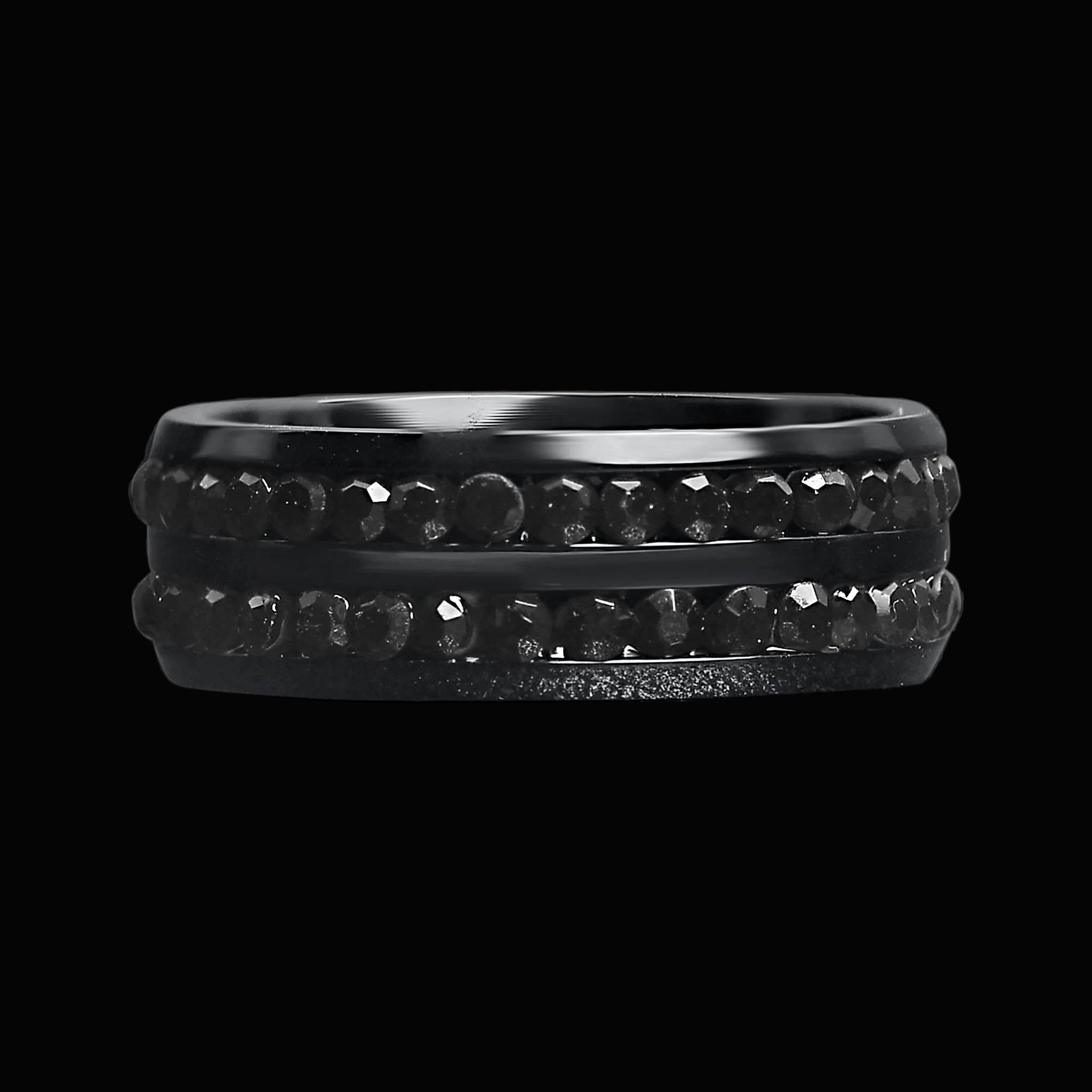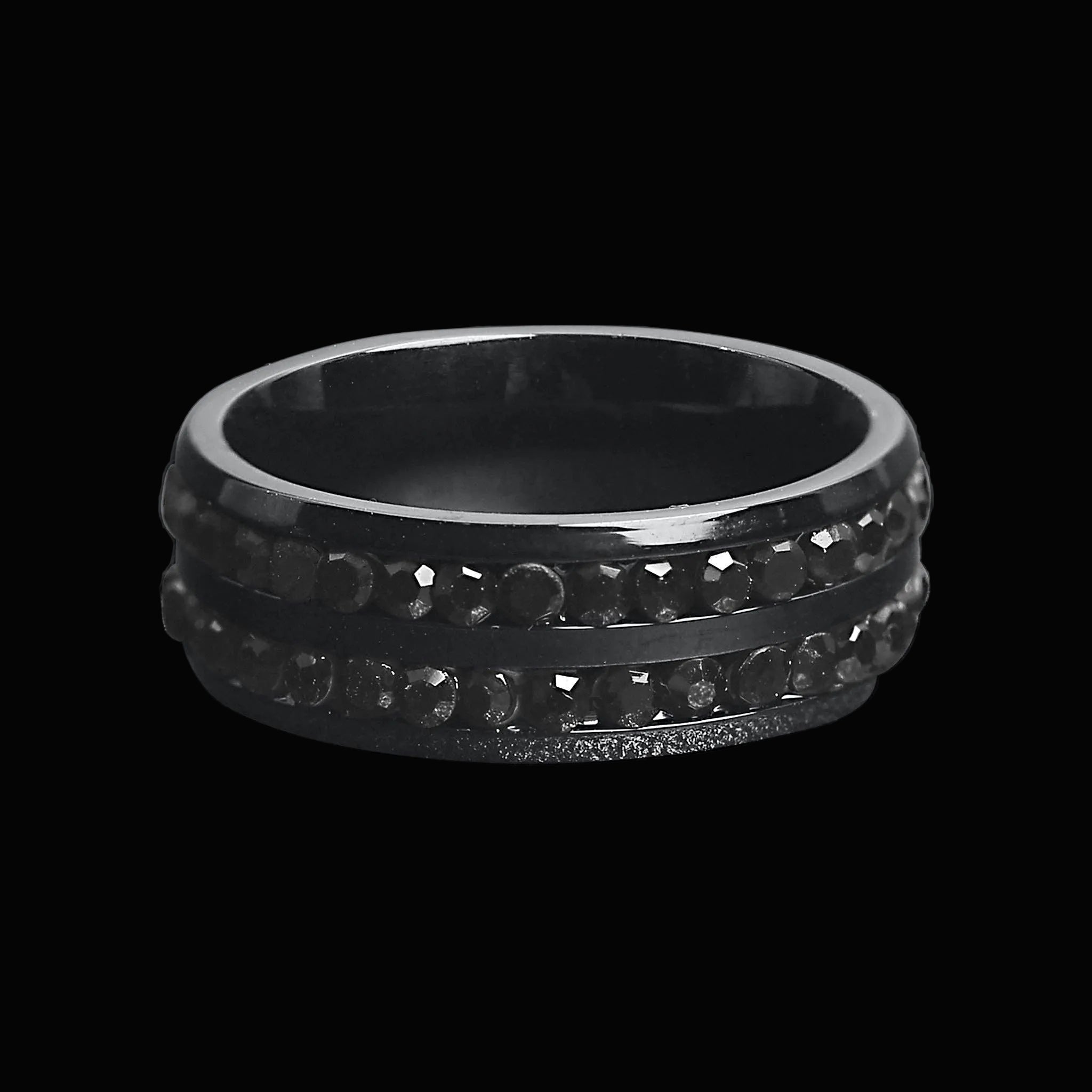 Last Call Band is a solid stainless steel ring set with a row of black CZ stones and finished with a blacked-out trim that keeps it mean, not flashy. It’s weighty, low-profile, and built to take abuse—bar rails, steering wheels, bad nights, repeat.