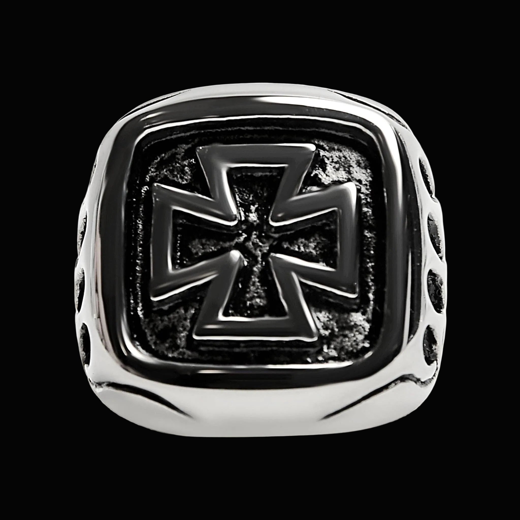 Cross cut deep. Flames carved hard. Heavy signet face with blackened detail and polished steel frame. No shine without backbone.