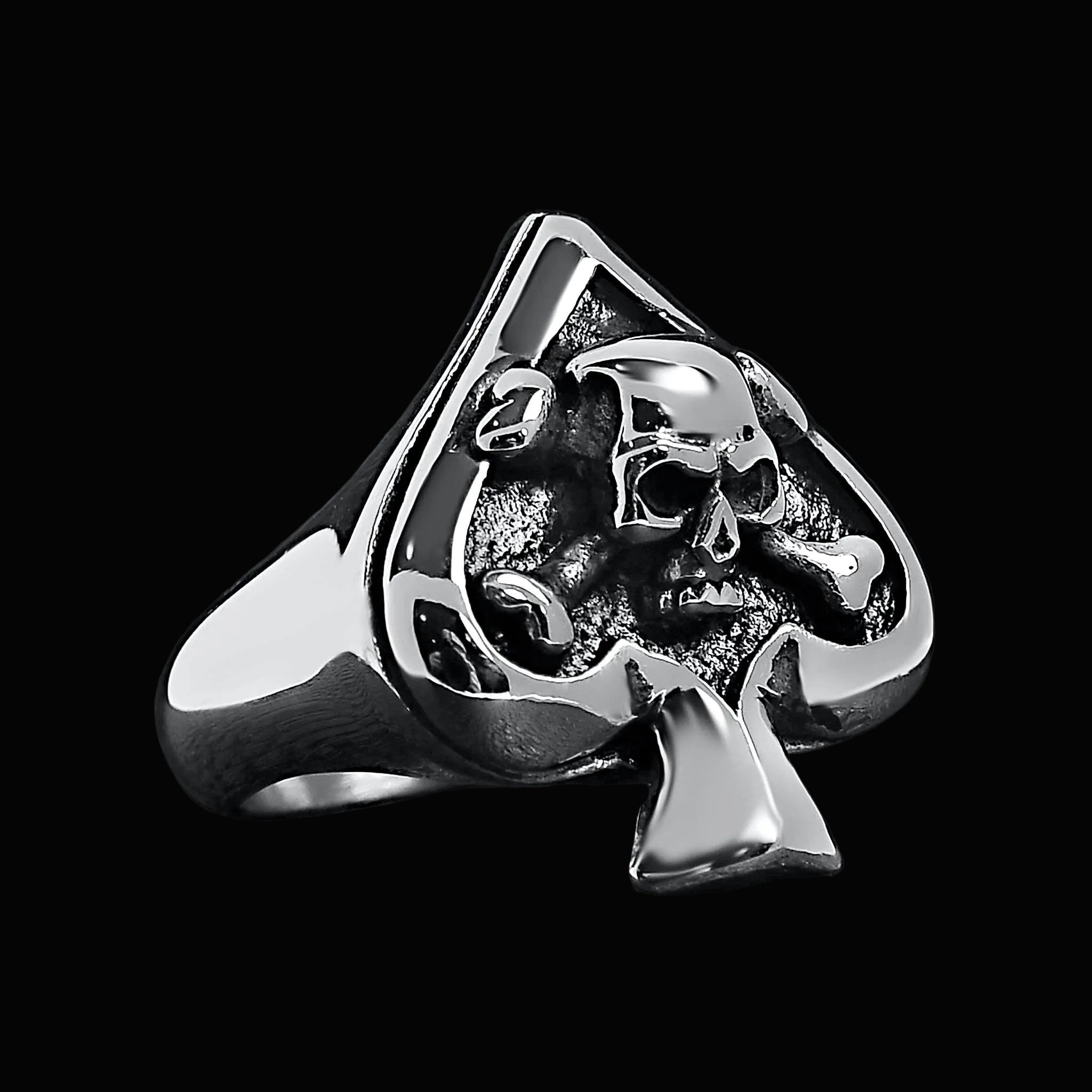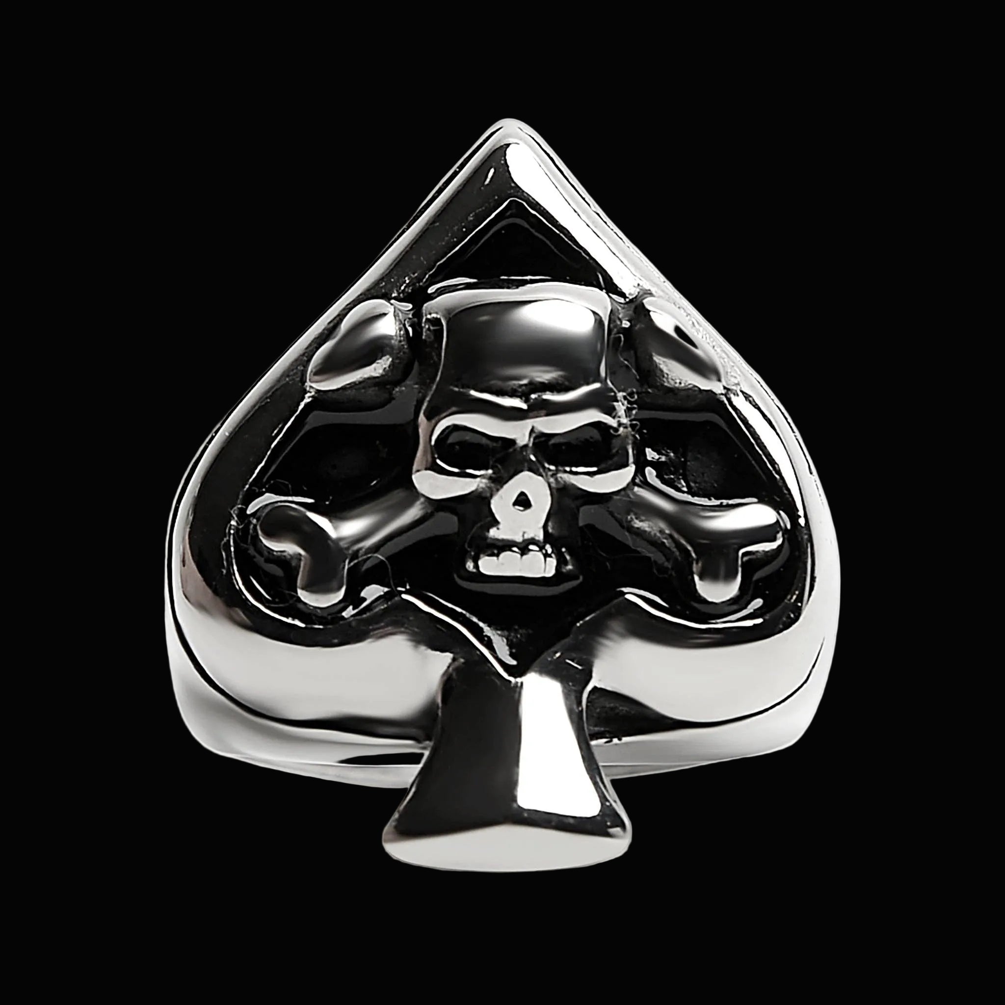 Ace of the Dead is a heavyweight stainless steel signet built around a spade silhouette with a sculpted skull set deep into the face. High-polish steel keeps it clean, while the depth and weight give it that knuckle-dragging presence you want from a real ring—not costume, not novelty.