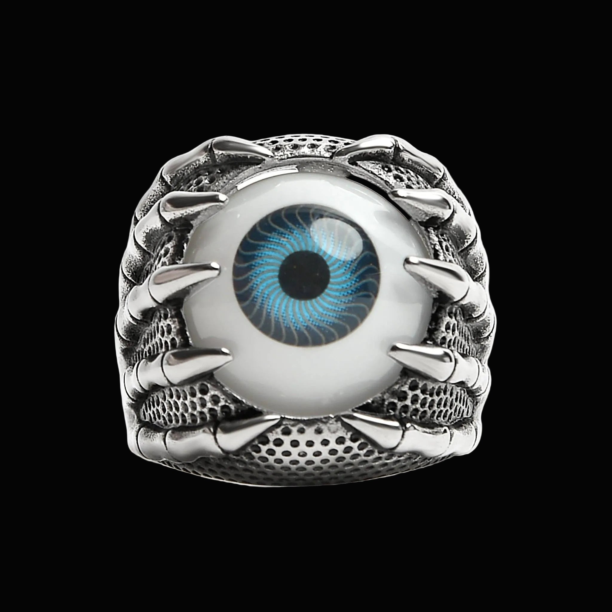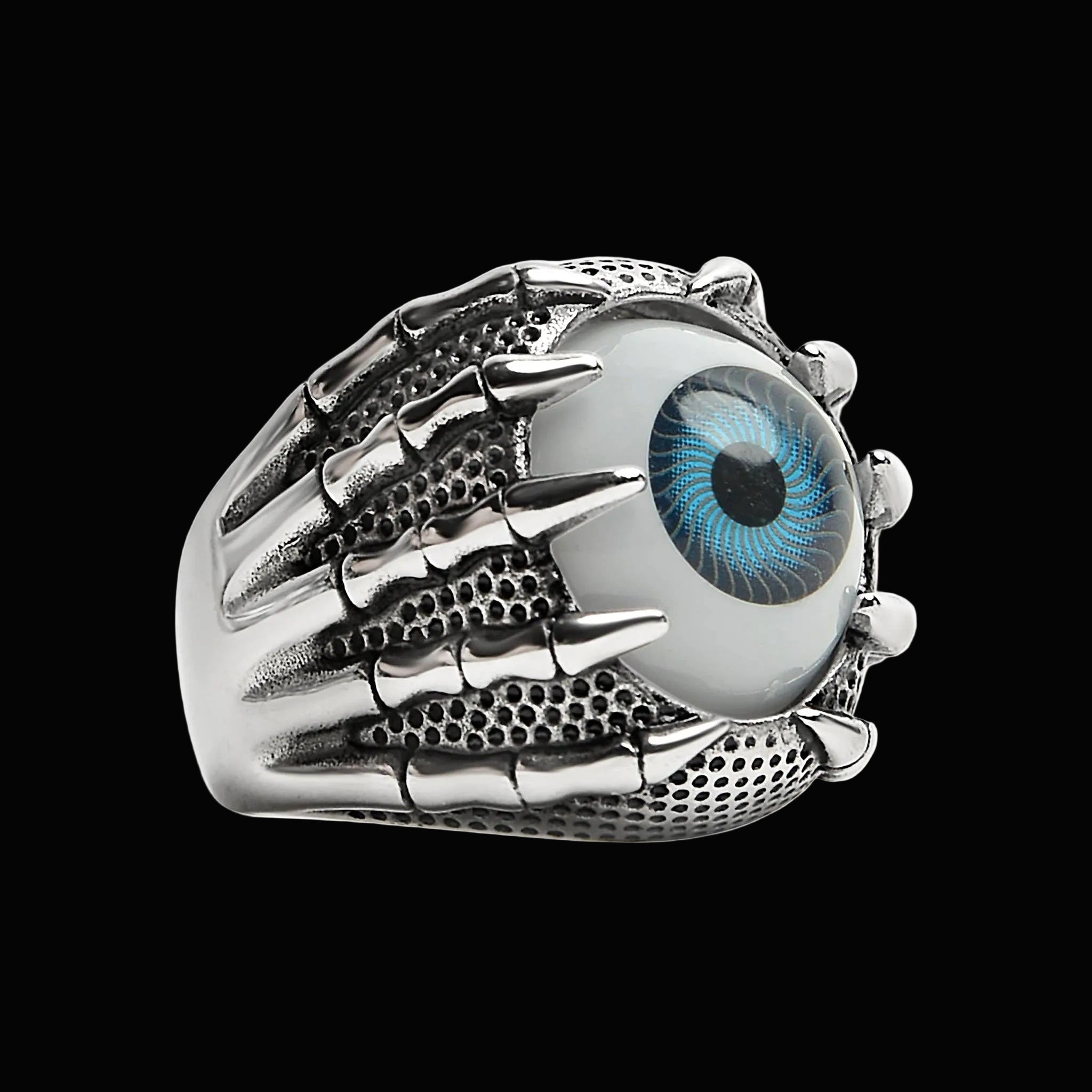 Cold steel hands. One unblinking eye. Skeletal grip wrapped around a blue stare set deep in solid stainless. Heavy detail. Hard presence.